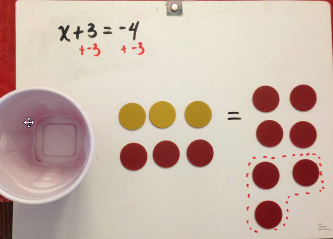 I have never really used manipulatives in my algebra class. They seemed like they would take a lot of time for not enough payout. Yet, my direct instruction (lecture and Flipped video) did not seem to get enough students to where they needed to be. Our text breaks down solving linear equations into two sections: (1) 1-step problems (e.g x – 2 = 6) and (2) multi-step problems (e.g. 3x – 1 = 9) where we combine the addition and multiplication principles. Perhaps I am guilty of rushing through the 1-step problems and not giving students a foundation in the two principles separately. I have modified an activity that was used with multi-step equations to be used for 1 step equations.